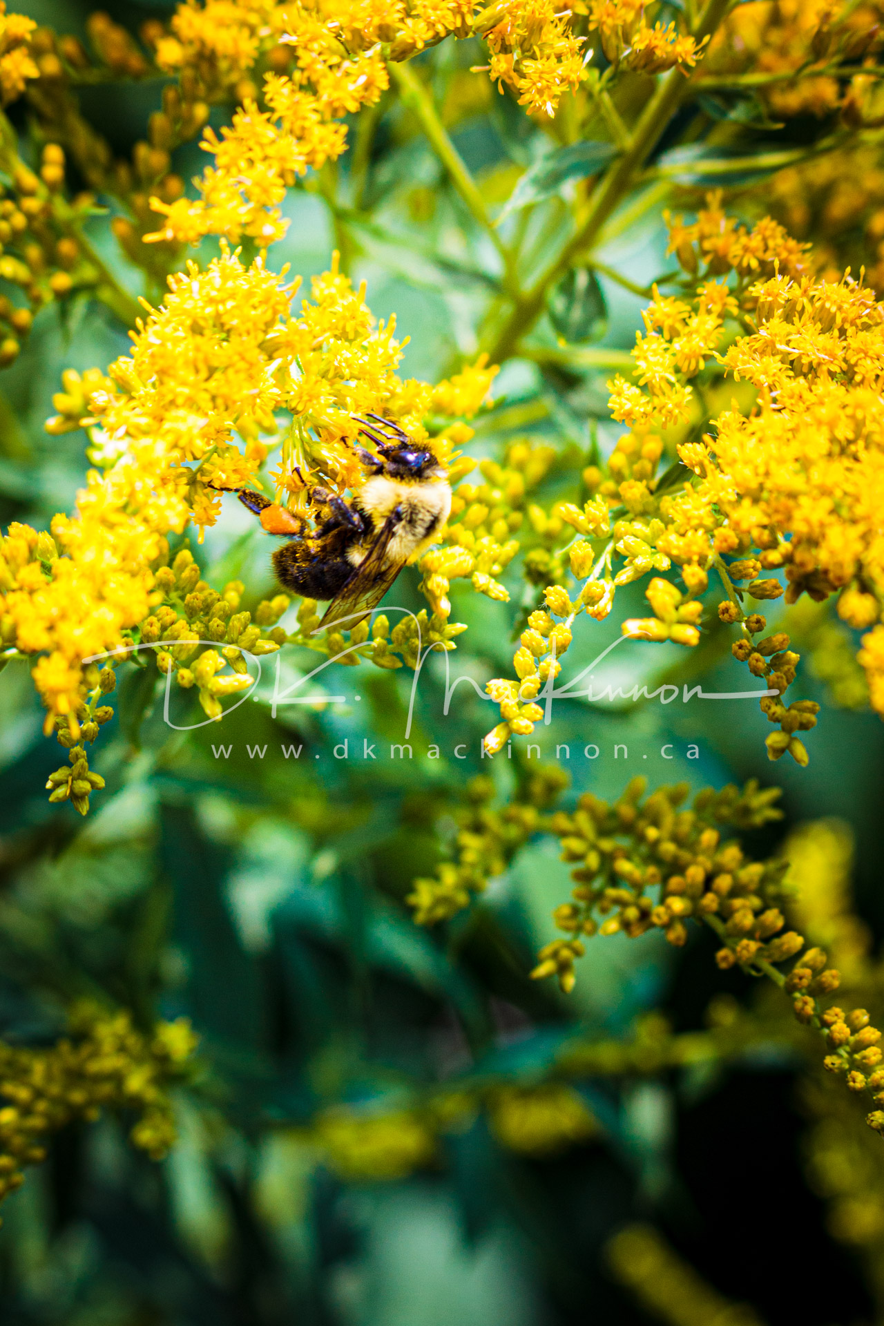 A close-up shot of a bumblebee covered in pollen, clinging to a cluster of bright yellow wildflowers, amidst a backdrop of green foliage. Print-quality TIF image suitable for up to 8 x 12 inch printing.