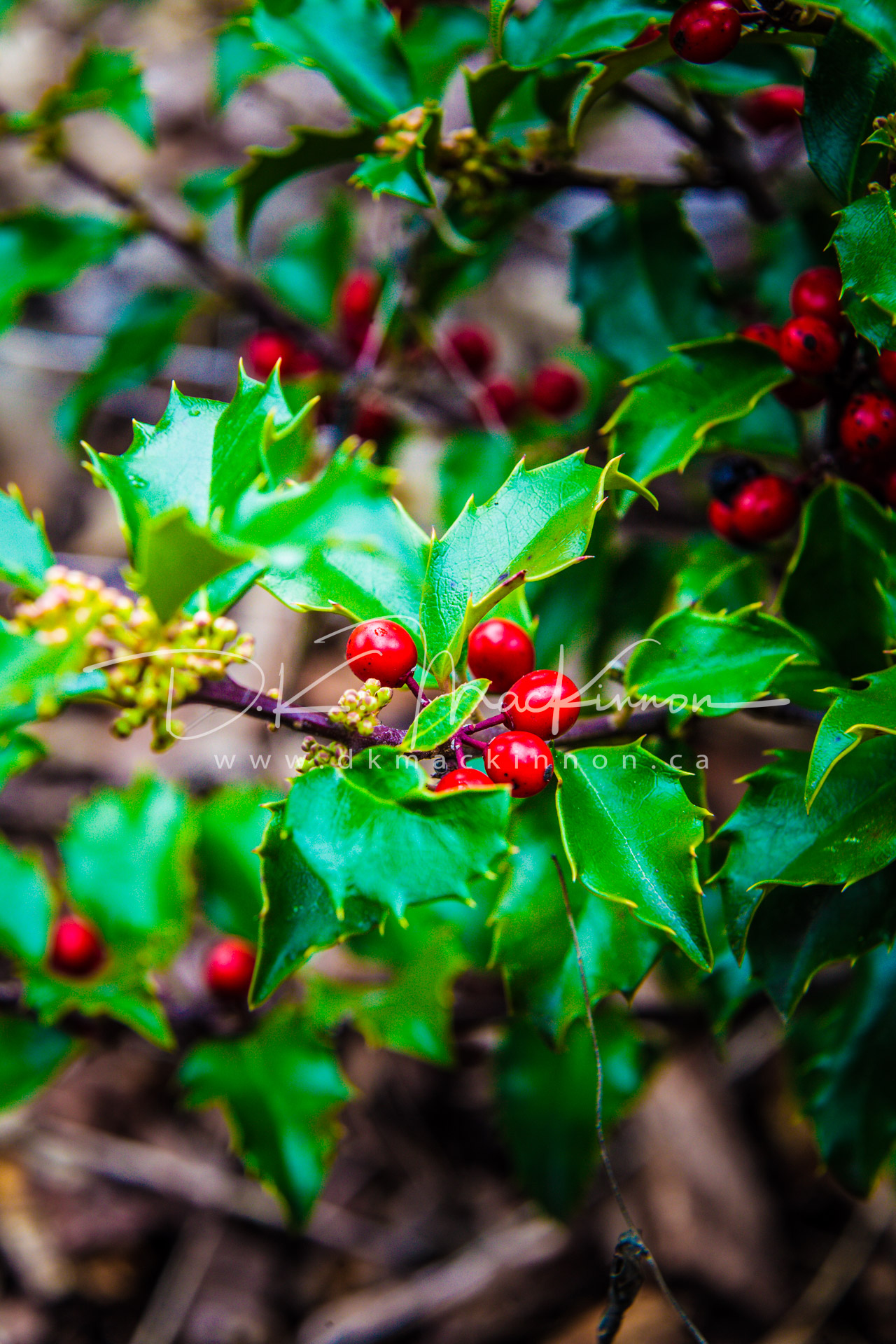 Close-up of holly plant branch with vibrant green, spiky leaves and bright red berries against a blurred background.