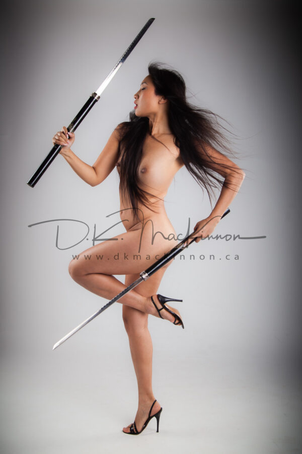 Nude Asian woman in high heels posing with two samurai swords against a grey gradient background, one sword held above her head and the other at an angle near her legs, long hair flowing.