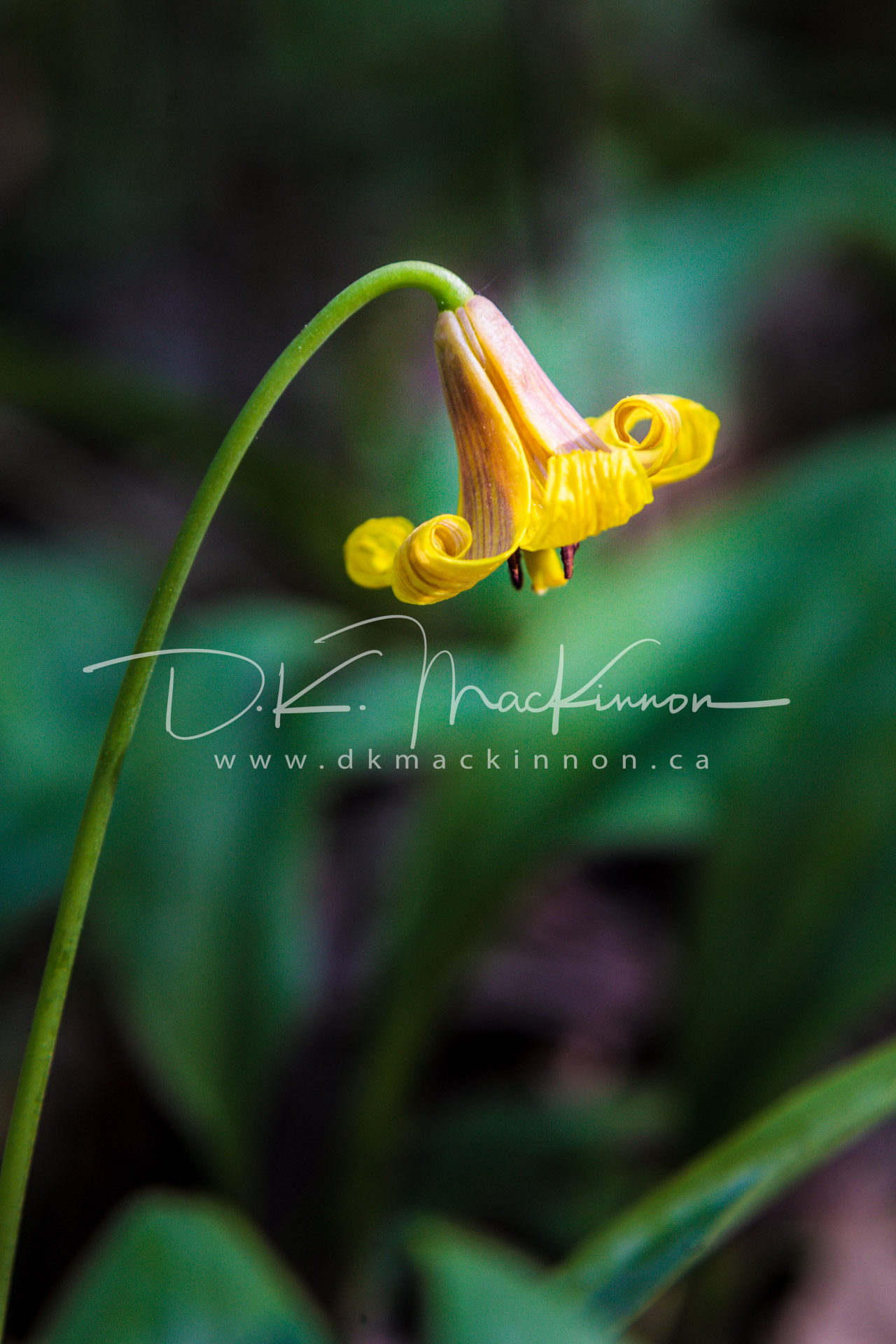 Close-up of a yellow Trout Lily flower with curled petals, drooping from a curved green stem, against a blurred green and brown foliage background.