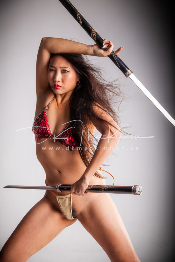 A woman with long dark hair, wearing a red scale-like bikini top and leather thong, poses with two Japanese swords in a defensive stance against a grey gradient background.